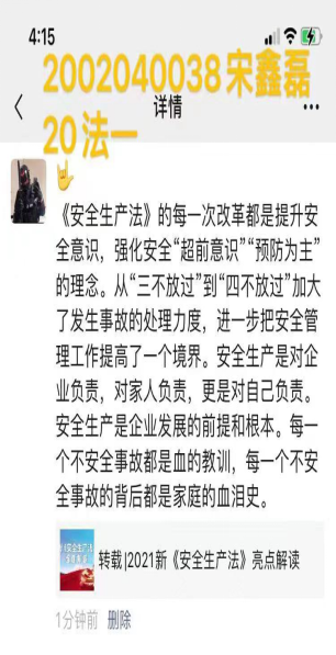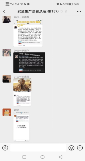 一是开展安全生产法主题宣传活动,活动面向政治与法律学院全体学生,包师政法先锋推送主题文章,同学阅读并发表20-50字的个人看法转载至朋友圈。自活动开始之日起,同学们主动报名参加活动,并积极转发了安全生产主题文章,阐述了对安全生产的感悟。
