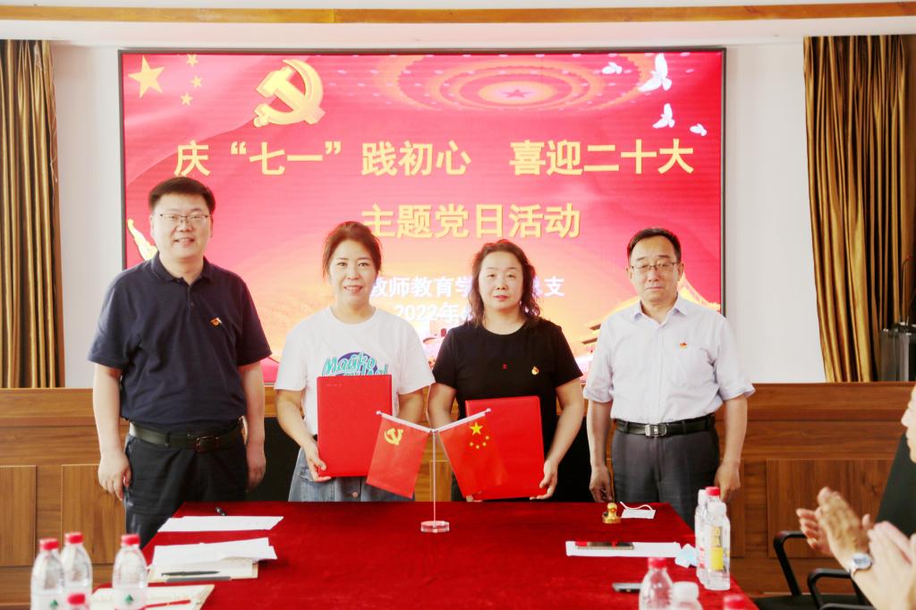 学院社区党委书记邓敬梅介绍了社区党员在日常管理、抗击疫情中党员发挥积极作用的情况,并与教师教育学院党总支签订了家庭教育、创新创业教育、继续教育等共建协议。