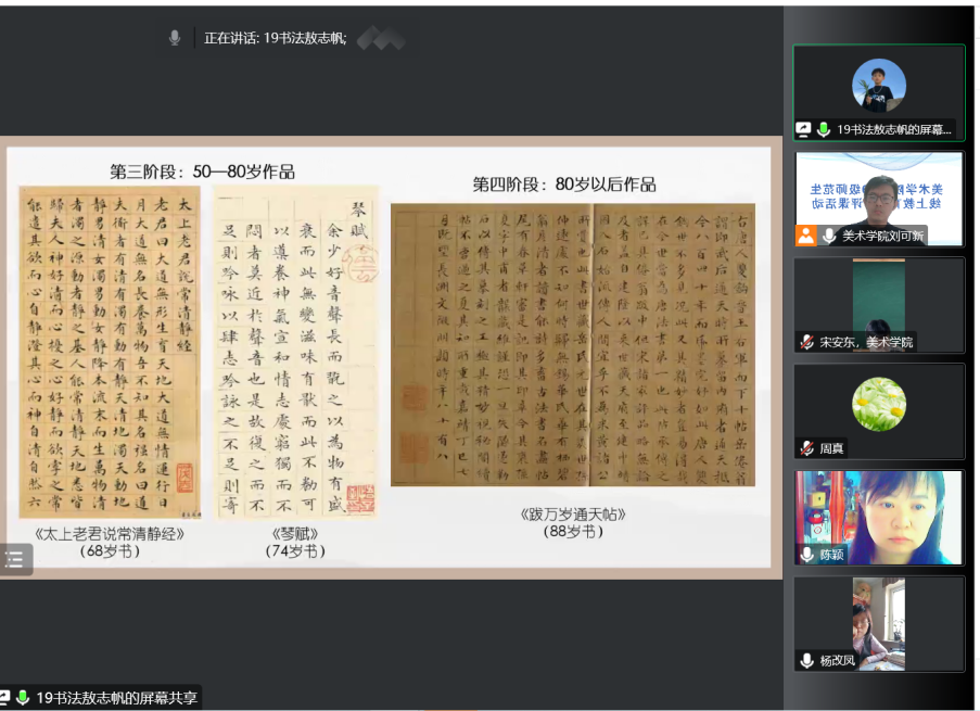 为彰显师范特色、强化师范类学生教学技能、切实增强其课堂教学实践运用能力,10月25日下午,美术学院组织开展线上教育实习评课观摩会。本次活动由美术学院艺术教育系主任刘可新主持,邀请包头市第三十六中学美术教师杨改凤、包钢第十五中学美术教师陈颖分别对6名2019级美术学、书法学专业学生的试讲逐一点评。美术学院领导史继敏、任成达、杨镇宇,教育实习指导教师和90名2019级师范类学生通过腾讯会议观摩学习。