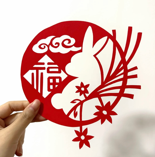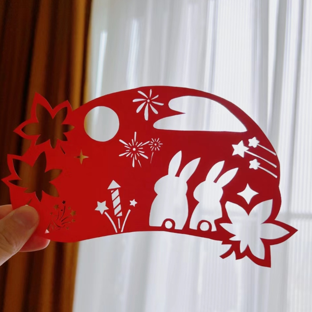 将传统剪纸与烟花、枫叶、兔子等图案结合,从而做到继承传统,推陈出新。2023年是兔年,兔子望月浮现一种归家之情。