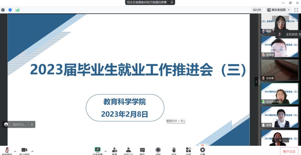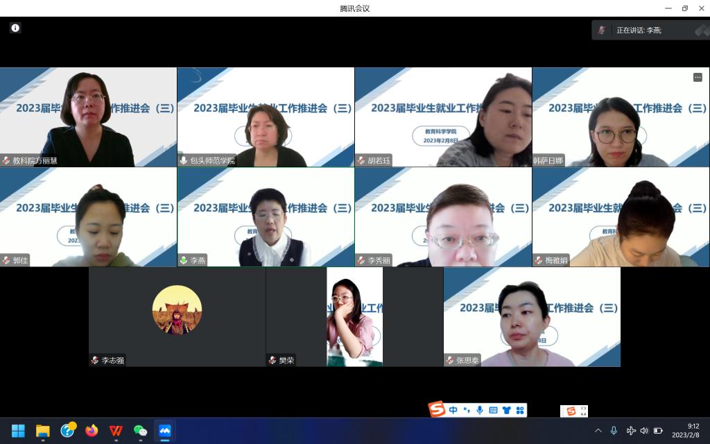 为传达学校就业工作推进会精神,推动2023届毕业生就业工作有序高效的开展,教育科学学院于2023年2月8日线上会议召开了第三次就业工作推进会。院长李芳、党总支副书记李燕,各专业系主任、各毕业班班主任、学工办主任方丽慧参加了此次会议。