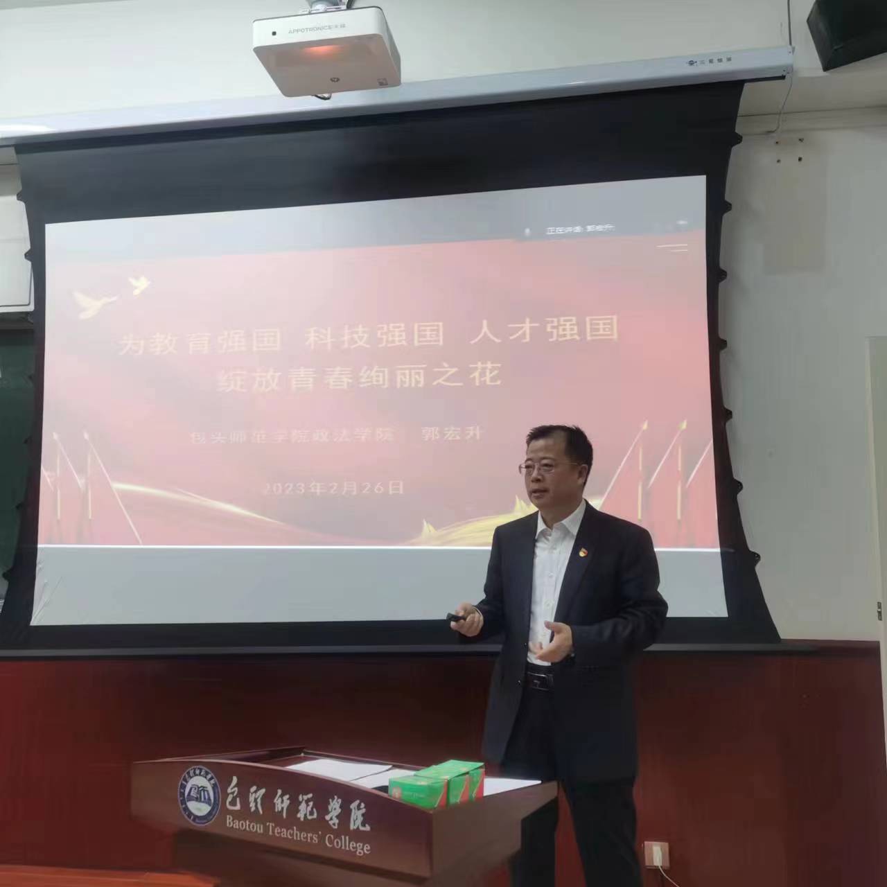 郭宏升副书记结合2022年考研真题、大学生所学公共课、青年大学生负有担当民族复兴时代大任几个方面阐述了为什么要学习党的二十大精神;从教育科技人才部署位置与过去的对比、世界科学中心的转移、教育科技人才的作用三个方面,深入浅出地讲解了党的二十大把教育科技人才单独列章放到第五部分的深刻用意,用包头师院多年来的发展变化,说明了我校在教育上取得的进步,国家在教育事业上取得的成绩;最后,他提醒同学们要原原本本阅读党的二十大报告、用心用情用力学好六门公共课、积极参加各类比赛活动、立志做有理想、敢担当、能吃苦、肯奋斗的新时代好青年,让青春在全面建设社会主义现代化国家的火热实践中绽放绚丽之花。郭老师的讲课声情并茂、生动活泼、例证丰富、数据详实,结合了学生的实际和自身体验,用双语授课,引发了在场同学的思考和共鸣,课堂上不时传出热烈的掌声。