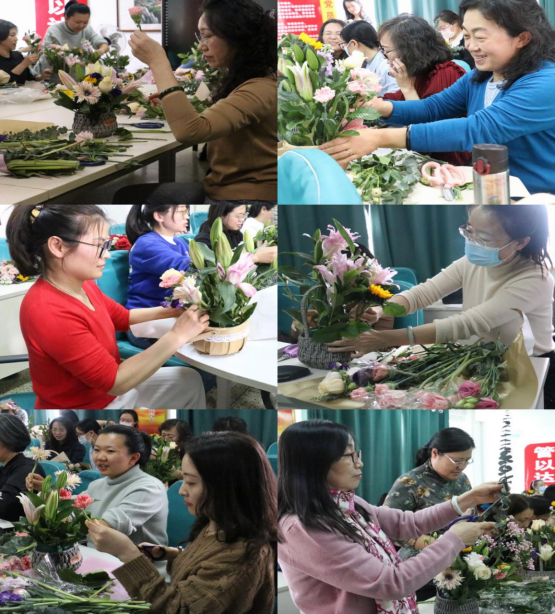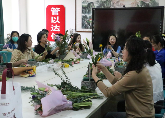 活动邀请了专业插花艺术老师指导。在花艺老师的悉心指导下,老师们在颜色、层次等方面不断尝试,将不同的花材错落有致地搭配在一起,再以添加绿色枝叶作为衬托。老师们在动手制作时,慧心巧思,活动现场轻松而愉快,洋溢着欢声笑语。