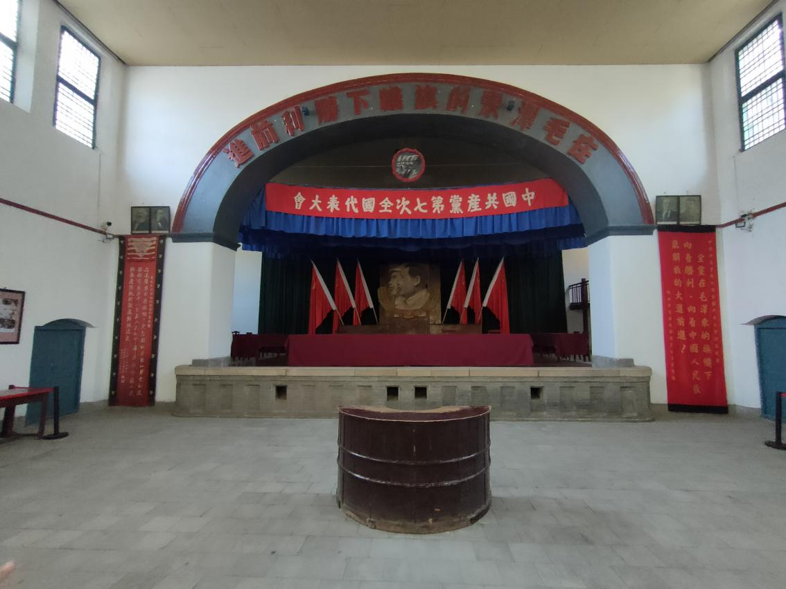 走进中央大礼堂,里面的陈设仍然保持着66年前的风貌。主席台正中是毛泽东、朱德的巨幅画像;会场后面墙上,悬挂着“同心同德”4个大字;两侧墙上悬挂4幅“坚持真理”、“修正错误”标语;靠墙边插着24面红旗,象征着中国共产党24年奋斗的历程;插红旗的“V”字形木座是革命胜利的标志;在主席台的正上方,悬挂着一条引人注目的横幅:“在毛泽东的旗帜下胜利前进!”