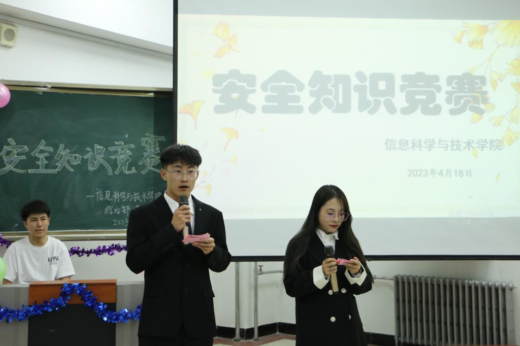 为全面贯彻落实党的二十大精神,推动国家安全宣传教育工作,提升学生安全意识和素养,增强自我防护能力,维护全体学生的人身权益和校园安全,构建和谐校园,引导大学生增强自护、自救知识储备,强化大学生安全的自我教育、自我管理,维护校园安全稳定,4月18日,在第八个全民国家安全教育日之际,信息科学与技术学院在博学楼东506教室举办“牢记安全知识,筑起安全防线”安全知识竞赛决赛。本次活动邀请到了包头师范学院保卫处治安科科长张德华老师、学工办负责人姜嘉丽老师、信息学院学工办辅导员王凝老师、李建霞老师、亢智鹏老师担任评委,同时我院各班级学生代表共同观看了比赛。