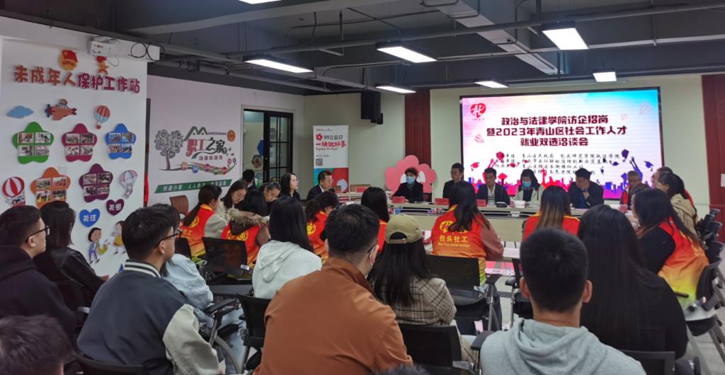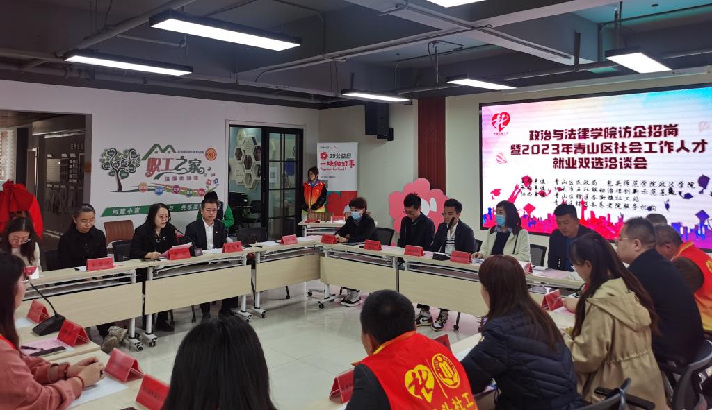 为深入贯彻党的二十大精神,全面落实党中央对高校毕业生就业创业工作的决策部署,抢抓春季促就业关键期,全力促进毕业生顺利就业,4月24日上午,政法学院联合青山区民政局,在青山区五社联动治理创新示范基地开展了访企拓岗暨2023年青山区社会工作人才双选洽谈会。