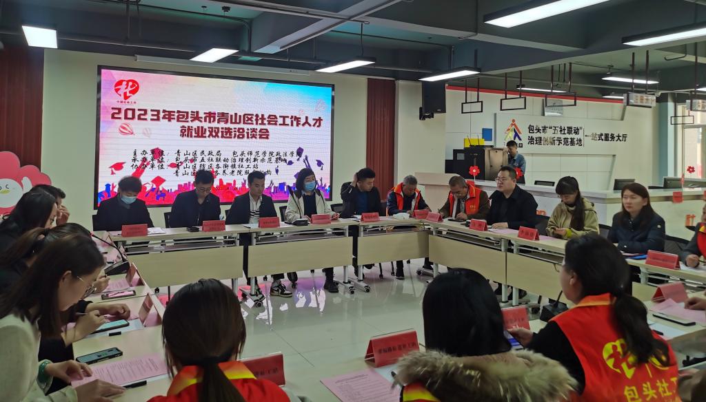 青山区民政局局长李锦艳、副局长郑立娇、青山区五社联动治理创新示范基地负责人、政法学院优秀校友高峰、青山区10个街镇社工站项目代表、5家养老院服务机构代表、包头师范学院政法学院副院长李霞、党总支副书记郭宏升、社工系主任王金环、19社工班班主任贾少敏、辅导员白丽出席了会议。2023届社会工作研究生和在校全体本科毕业生参加了2023年青山区社会工作人才双选洽谈会。本次双选洽谈会由包头市青山区民政局、政治与法律学院共同举办,青山区五社联动治理创新示范基地承办,青山区辖区10个街镇社工站、5家养老院服务机构协办。