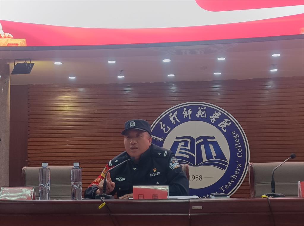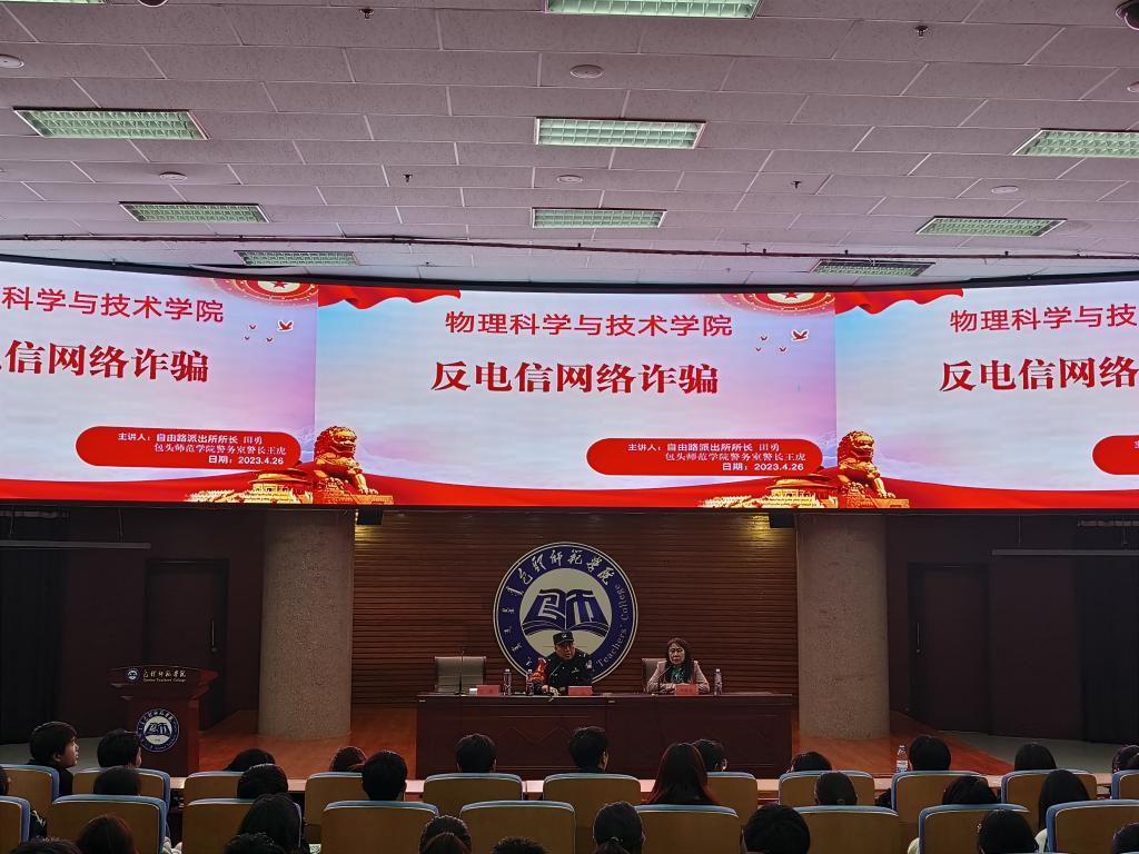 为进一步提高同学们的安全防范意识,增强对电信网络诈骗的犯罪识别和应对能力,筑牢防范电信网络诈骗的安全防线,维护校园和谐稳定。物理科学与技术学院于4月26日晚特邀包头市青山区自由路派出所所长田勇在博学楼学术报告厅为我院学生开展反电信网络诈骗专题讲座。包头师范学院警务室警长王虎、辅导员刘龙及全体本科生、研究生参加讲座。讲座由党总支书记李慧龙主持。