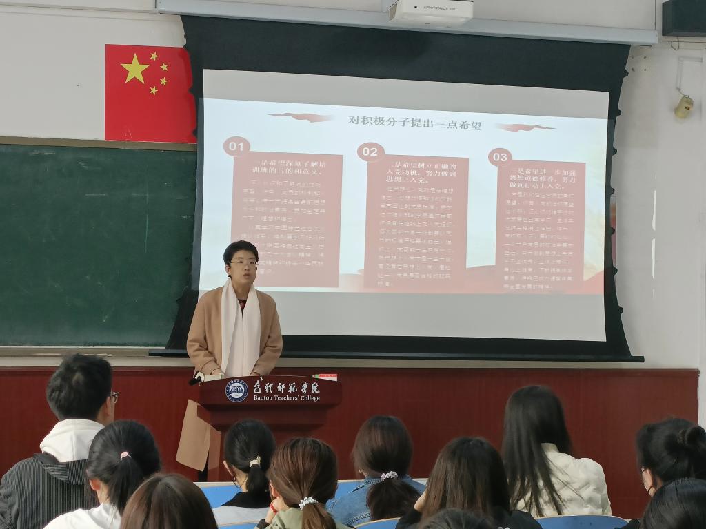 培训班开班仪式由党总支副书记李燕作了动员讲话。首先,李燕老师强调举办入党积极分子培训的重要意义。她指出开展培训是入党积极分子熟悉和掌握党的基本知识、基本理论的需要;是入党积极分子端正入党动机,提高思想政治觉悟的需要;是严格党员发展程序,提高党员发展质量的需要。其次,李燕老师对入党积极分子们提出了三点希望。希望入党积极分子们深刻理解培训班的目的;希望入党积极分子们树立正确的入党动机,努力做到思想上入党;希望入党积极分子们进一步加强思想道德修养,努力做到行动上入党。第三,李燕老师对本期入党积极分子提出了明确的纪律要求。一要遵守学习纪律,树立良好形象;二要理论联系实际,做到学以致用。上课认真听讲,认真思考,记好学习笔记。课下要保质保量完成学习内容和心得撰写,学员之间要互相促进,互相交流探讨,更好地提高学习效果,真正做到学有所思、学有所获、学有所得。