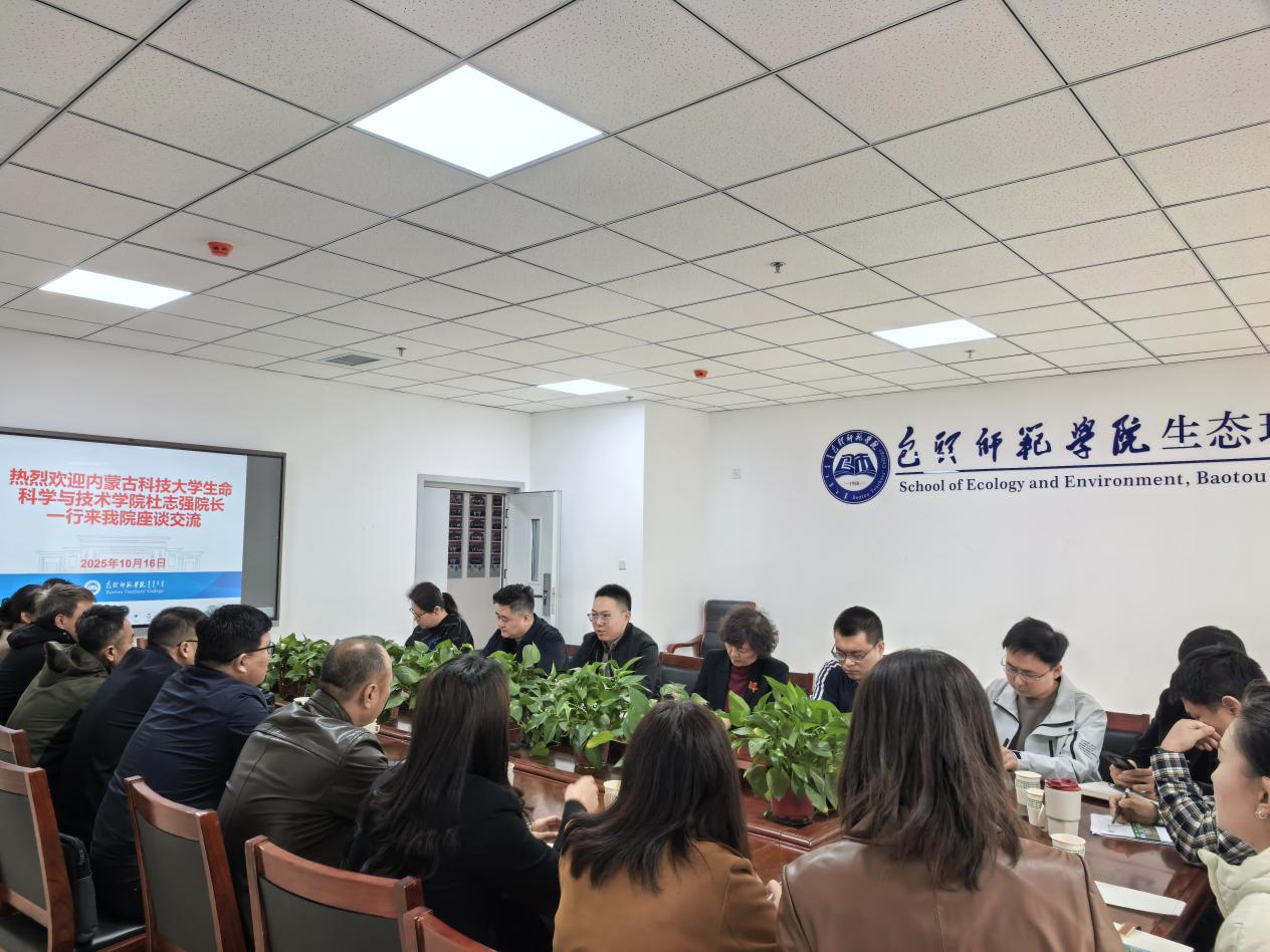 杜志强及来访人员分别介绍了内蒙古科技大学生命科学与技术学院在动物学、植物学及微生物学等方面的研究现状及取得的成果,希望与包师生态环境学院相关学科建设可以加强交流与合作,推进生物学科博士点建设。