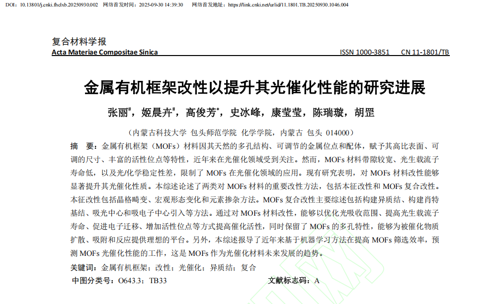 包头师范学院为第一署名单位,“包头稀土氟材料重点实验室”团队师生在中文领军期刊《复合材料学报》(中国科技期刊卓越行动计划--中文领军期刊,2024年度影响因子2.702)在线发表题目为“金属有机框架改性以提升其光催化性能的研究进展”的综述论文,我院2022级材料物理与化学研究生张丽和我院教师姬晨卉为共同第一作者,高俊芳教授为通讯作者。