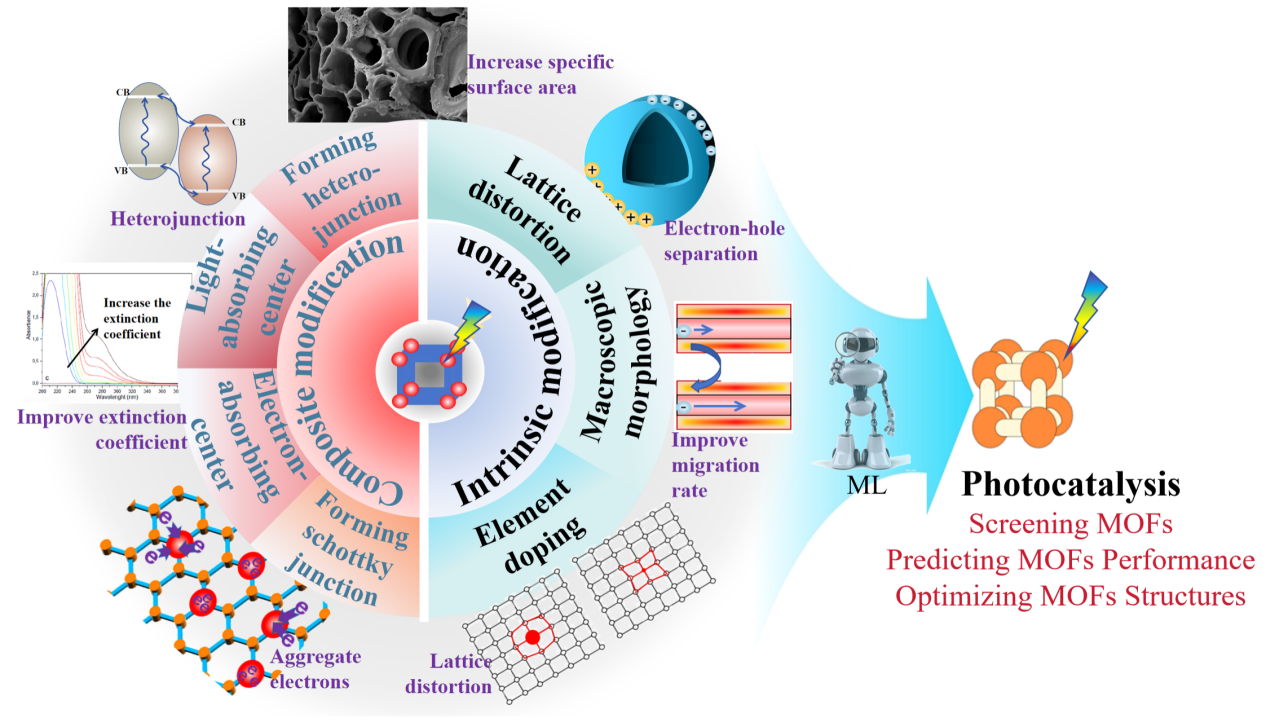 本综述论述了两类对MOFs材料的重要改性方法,包括本征改性和MOFs复合改性,本征改性包括晶格畸变、宏观形态变化和元素掺杂方法,MOFs复合改性主要综述包括构建异质结、构建肖特基结、吸光中心和吸电子中心引入等方法。通过对MOFs材料改性,能够以优化光吸收范围、提高光生载流子寿命、促进电子迁移、增加活性位点等方式提高催化活性,同时保留了MOFs的多孔特性,能够为被催化物质扩散、吸附和反应提供理想的平台。本综述报道了近年来基于机器学习方法在提高MOFs筛选效率,预测MOFs光催化性能的工作,MOFs作为光催化材料将是未来发展的趋势。(化学学院)