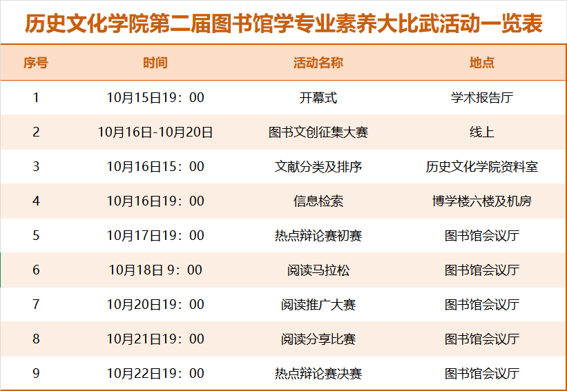 本次大比武精准聚焦 “专业能力锤炼” 与 “学科兴趣激发” 两大核心方向,结合参赛群体特点设计差异化赛事,覆盖图书馆学专业学生与历史文化学院全院学生,形成层次分明、特色鲜明的活动体系,具体安排如下: