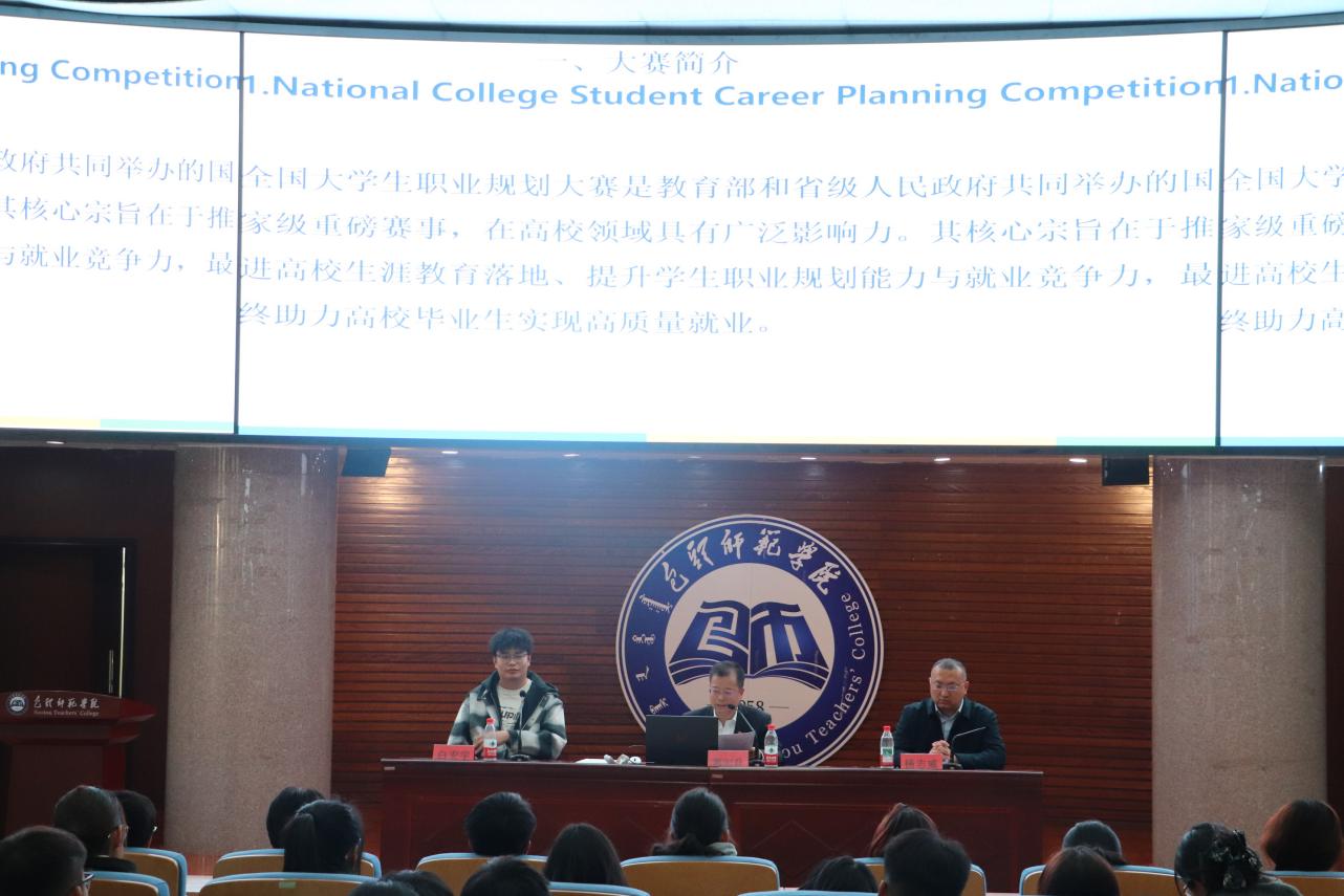 为深入贯彻落实教育部《关于举办第三届全国大学生职业规划大赛的通知》和我校有关文件精神,进一步强化大学生生涯教育与就业指导,提升学生职业规划意识和就业竞争力,10月26日下午,马克思主义学院联合化学学院在博学楼学术报告厅召开了第三届大学生职业规划大赛参赛动员会。马克思主义学院党总支副书记郭宏升、化学学院党总支副书记杨志威、第二届全国大学生职业规划大赛国赛金奖获得者、化学学院2022级学生白宏宇、两个学院学生代表400多人参加了会议。会议由化学学院党总支副书记杨志威主持。