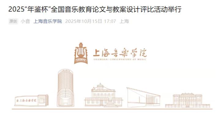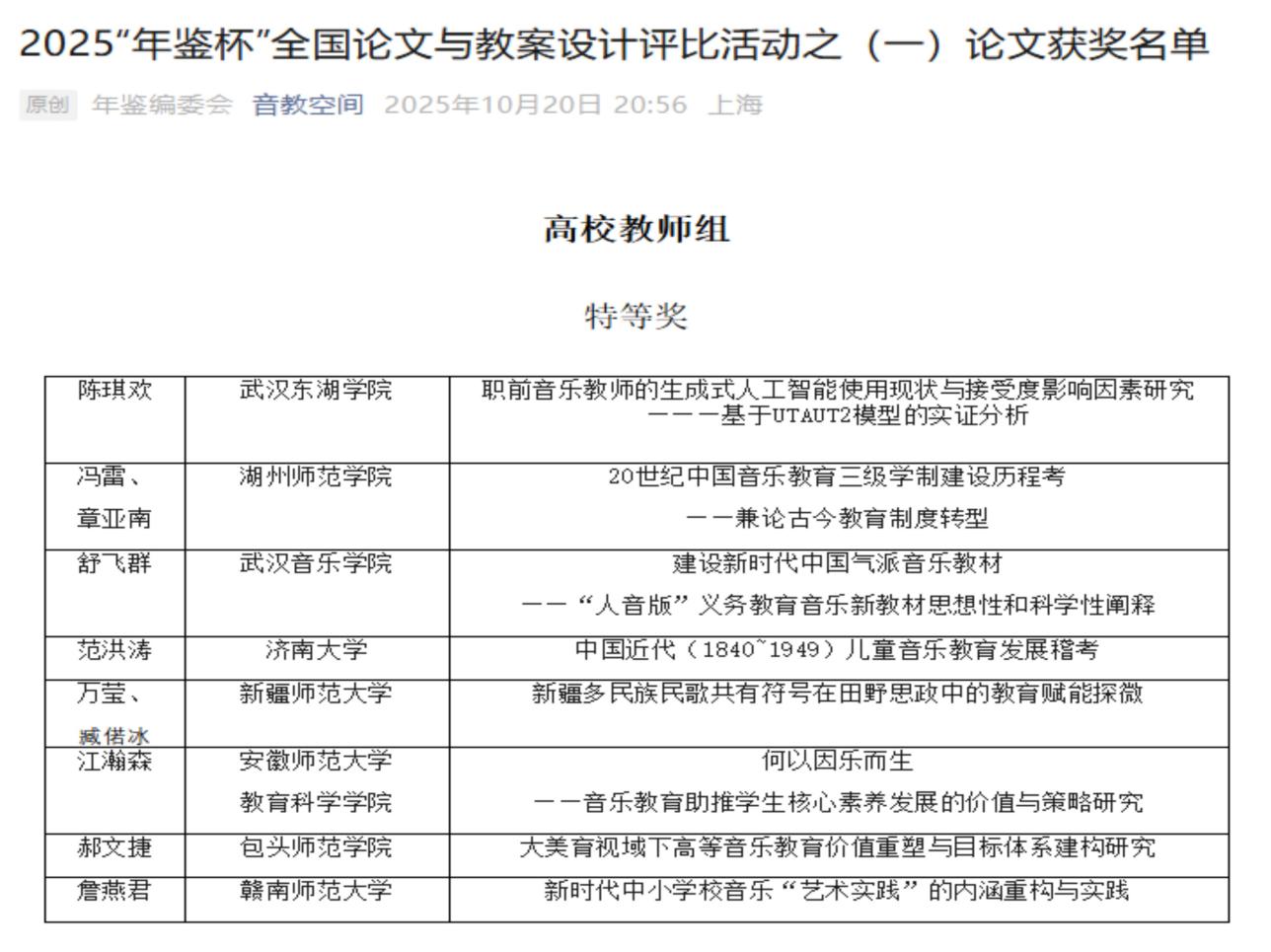 近日,2025“年鉴杯”全国音乐教育论文与教案设计评比活动圆满收官。该活动由《中国音乐教育年鉴》编委会主办,本次评比共收到论文、教案共2113份,我校音乐学院郝文捷教授参评论文《大美育视域下高等音乐教育价值重塑与目标体系建构研究》荣获高校教师组特等奖。