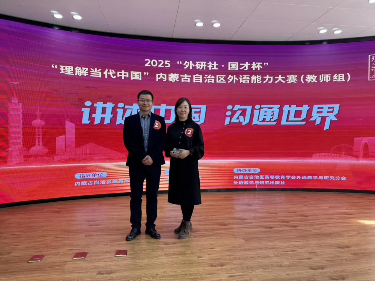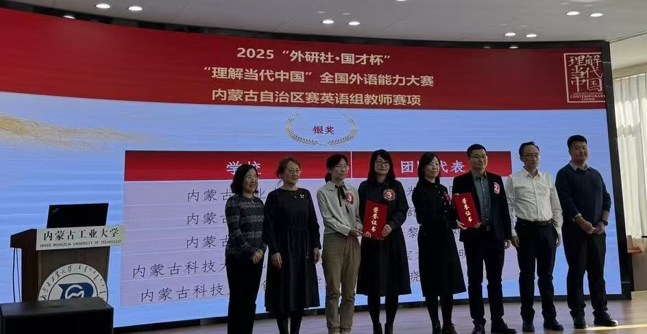 10月31日,由内蒙古自治区教育厅指导、内蒙古工业大学承办、外语教学与研究出版社协办的 2025“外研社・国才杯”“理解当代中国” 内蒙古自治区外语能力大赛落下帷幕。我校张宝龙、张晓敏、李荣华、郭荣、王坤等五位教师组成的团队历经校赛选拔、自治区赛比拼,凭借扎实的外语功底、深刻的理论素养与出色的国际传播能力,在教师组竞赛中斩获银奖,充分展现了我校教师队伍的专业实力与育人风采。