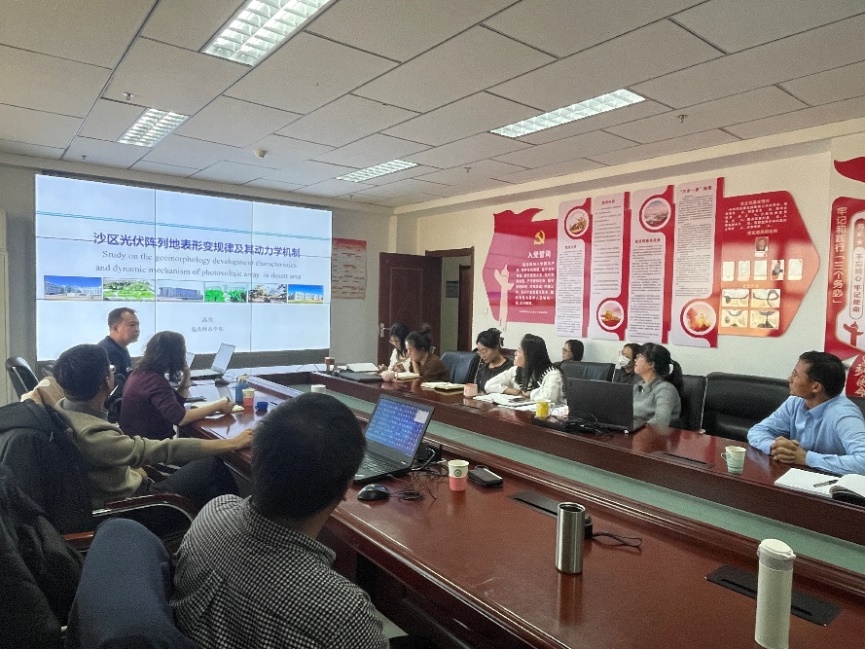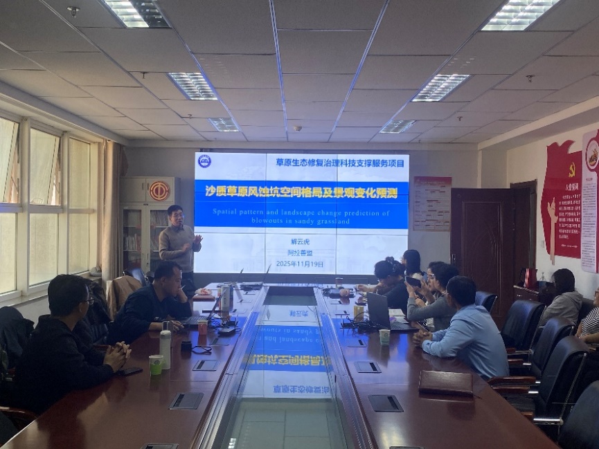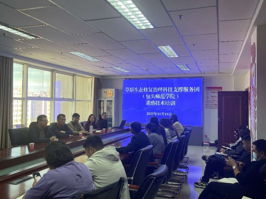 基于座谈与实地调研情况,科技支撑服务团队为阿拉善左旗草原工作站进行了专项技术培训。培训内容紧密结合当地实际需求,重点介绍了多项科技解决方案:运用卫星遥感技术快速精准服务草原管理工作;构建空天地一体化监测体系,以实现生态修复成效的精准追踪;针对强风蚀问题,提出了网格沙障与生物固沙相结合的复合型防控方案;对于光伏电站的生态影响问题,讲解了光伏板间距优化、板下抗风蚀植被筛选等关键技术,为“沙治与治沙”的良性互动提供了理论支撑。此外,遥感与地理信息技术在草原生态修复工程方案设计与生态修复工程成效评估应用也成为技术培训的重点,旨在推动当地生态修复治理从经验依赖向数据驱动转型。