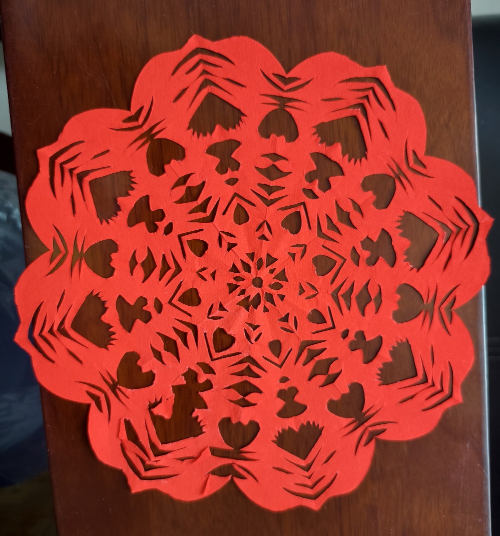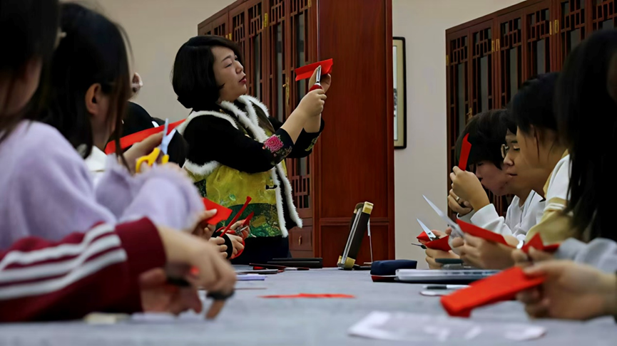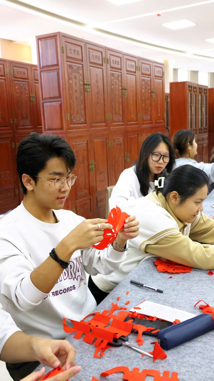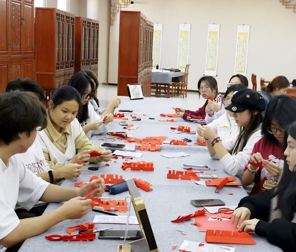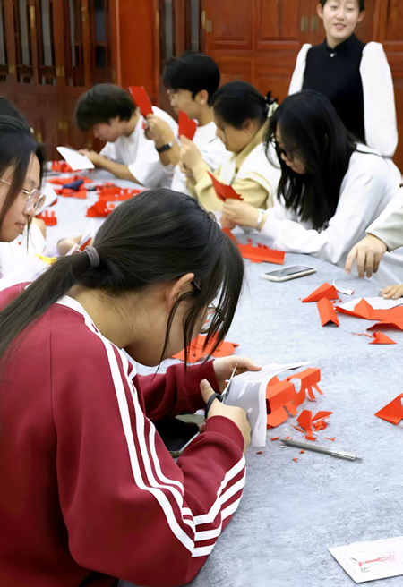 同学们热情高涨,手持剪刀、红纸专注创作,从折叠、勾勒到裁剪,一张张红纸蜕变为寓意美满的双喜字、纹样繁复的团花和栩栩如生的生肖马。大家相互交流技巧、分享成果,现场洋溢着浓厚的文化氛围与创作乐趣。