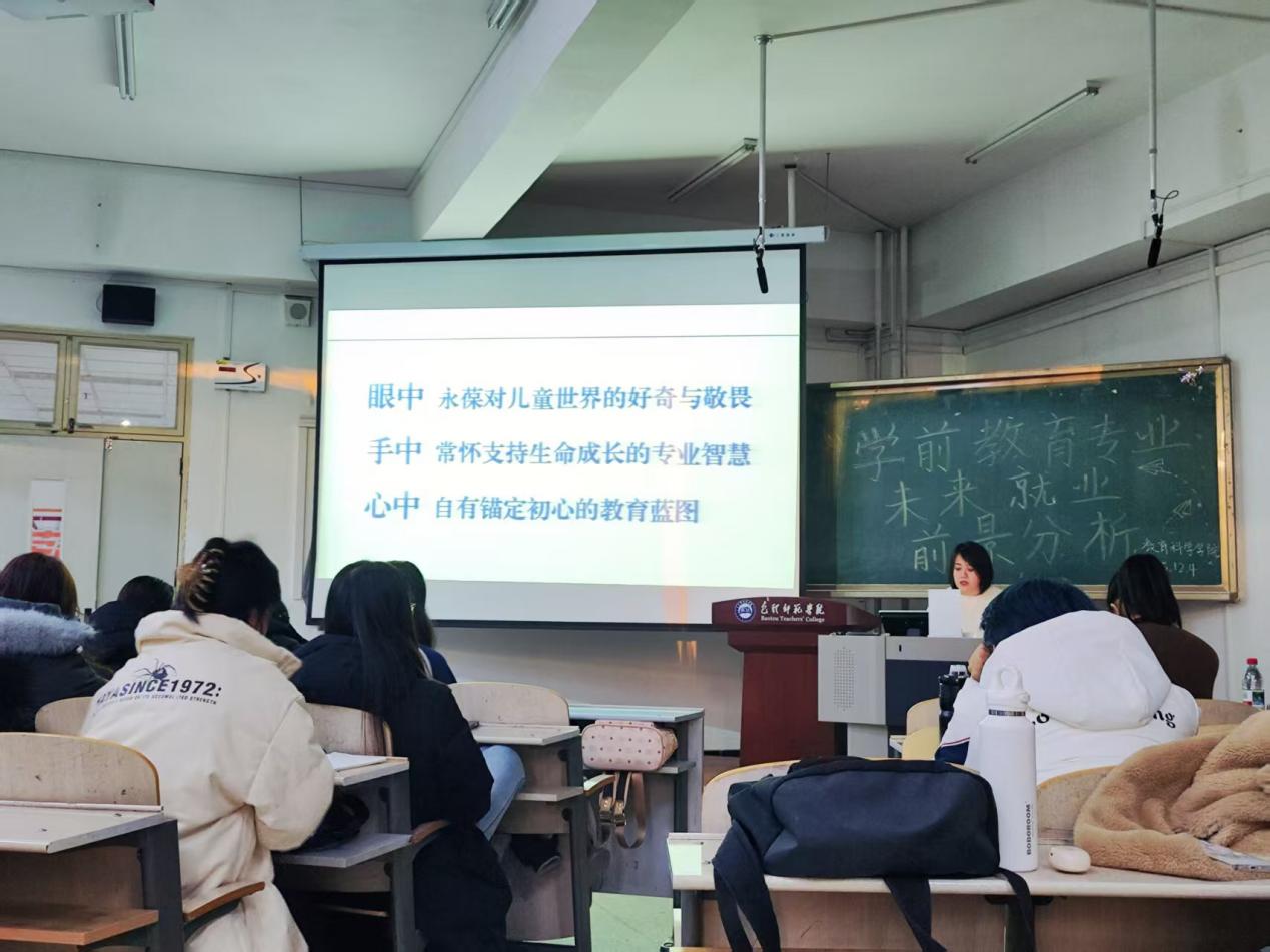 为深入推进教育科学学院与包头师范学院实验幼儿园党建结对共建项目,以党建为引领帮助学前教育专业学生科学规划学业与职业发展,提升专业素养,学院于12月4日下午在博东204教室开展主题为“锚定初心,启程未来”的学前教育学生就业前景规划专题讲座。本次讲座特邀包头师范学院实验幼儿园资深教师刘菊担任主讲,实验幼儿园园长王惠、学前与心理教工党支部书记陆畅、组织委员杨利霞和2023级、2024级学前教育专业学生参加了会议。