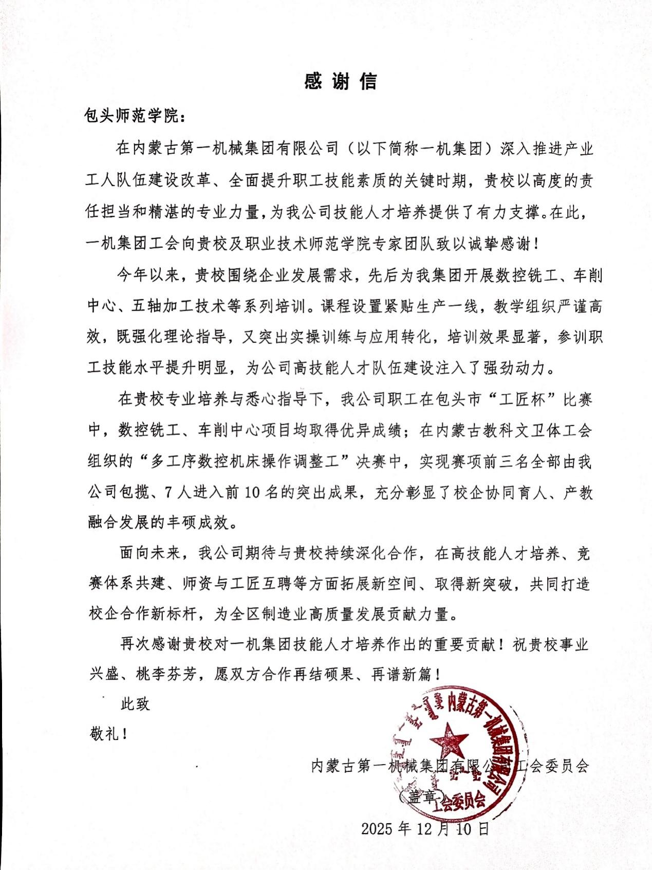 近日,职业技术师范学院收到来自内蒙古第一机械集团有限公司的感谢信,对我校在企业产业工人队伍建设改革与技能人才培养中的专业支持与协同贡献给予高度肯定。信中指出,在一机集团全面推进数控加工、车削中心、五轴加工等技能培训的关键时期,我院发挥专业优势,高效组织,提供精细化指导,参训职工技能水平明显提升,为公司高技能人才队伍建设注入强劲动力。