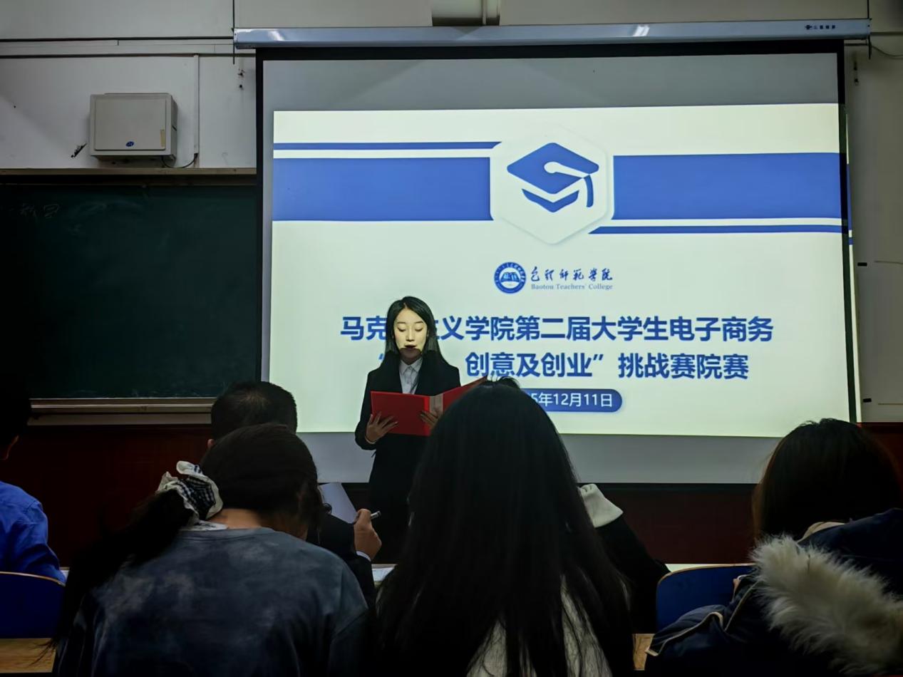 为深化实践育人成效,引导学生将专业知识与电商创新实践深度融合,激发青年学子的创业热情与创新活力,12月11日下午,马克思主义学院在博学楼600教室举办第二届大学生电子商务“创新、创意及创业”挑战赛决赛。来自25思政班、24思政一班、二班、23思政一班共17名同学组成四支队伍参与比赛。学院党总支副书记郭宏升、学工办主任李世光、辅导员乌云塔那老师担任比赛评委。