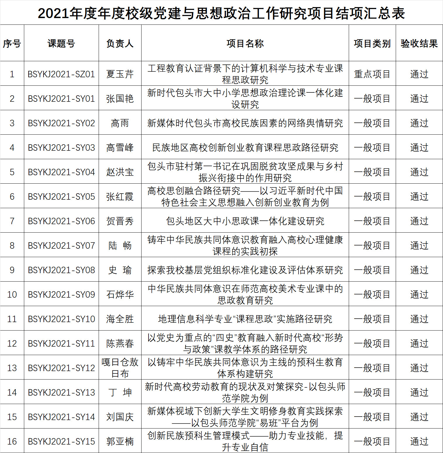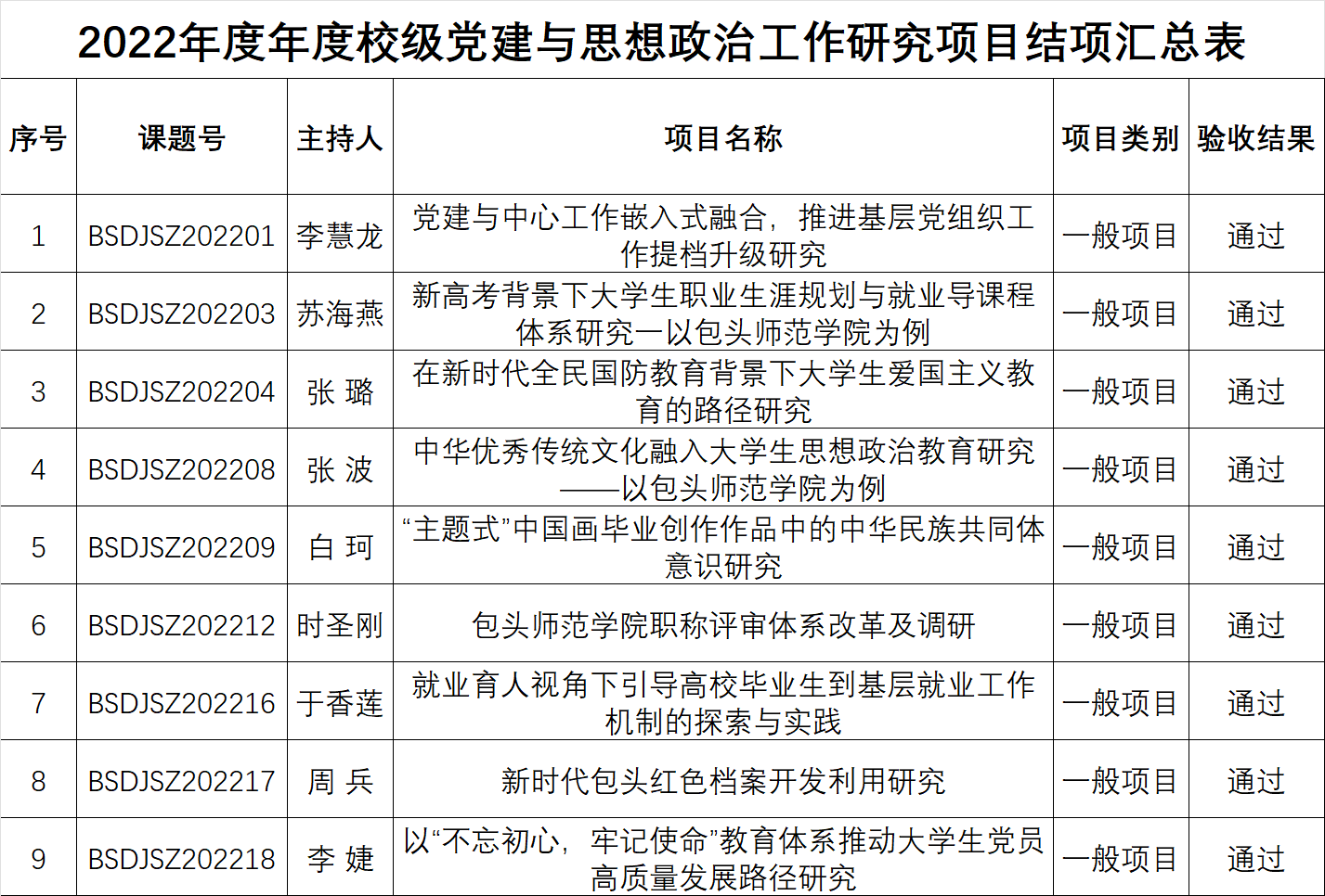 各学院、各部门: 根据学校2021年度校级党建和思想政治教育研究项目、2022年度校级党建与思想政治工作研究项目立项要求,宣传部组织专家对两类校级科研项目进行审核、验收,现将2025年通过结题验收的项目名单予以公布。 同时,对因研究内容调整、研究进度安排等原因,未能按期完成结题的项目,经项目负责人申请、所在单位同意,部分项目同意延期结项。延期项目须在批准的延期时间内完成结题验收,逾期未结题的,将按照有关规定处理。现将有关情况通知如下: 一、通过结题验收项目 二、同意延期结项项目 (详见附件《申请延期结项项目名单》) 三、公示及其他事项 本次结题验收及延期结项情况公示时间为2025年12月19日至2025年12月25日。公示期间,如有异议,请拨打联系电话:6193039。 特此通知。 附件:申请延期结项项目名单 党委宣传部 2025年12月19日
