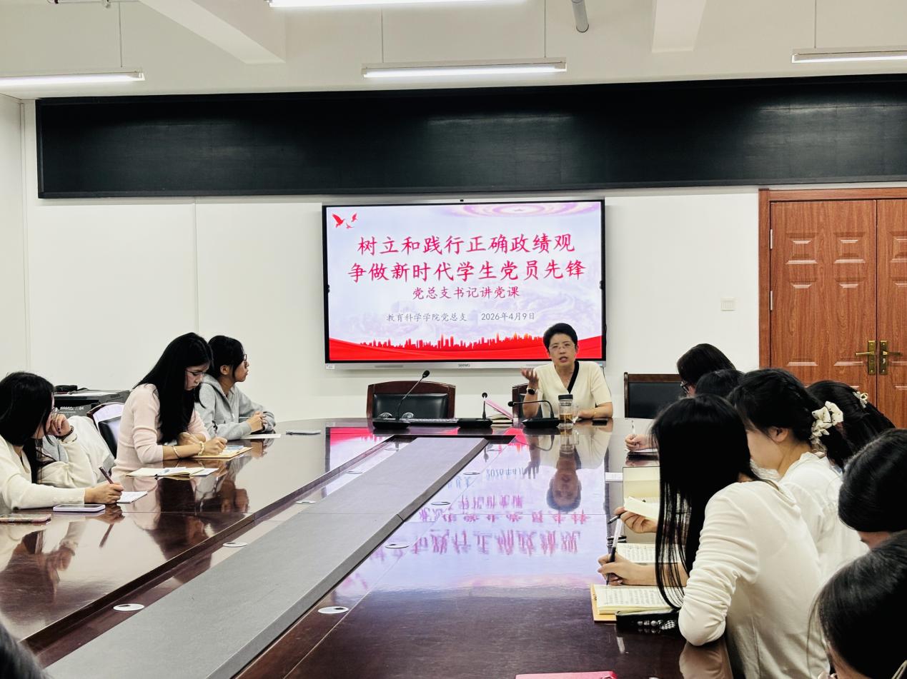 为深入推进树立和践行正确政绩观学习教育走深走实,切实强化学生党员党性修养,引导青年学子扣好人生“第一粒扣子”,2026年4月9日,教育科学学院开展党总支书记讲党课活动。党总支书记李燕以“树立和践行正确政绩观,争做新时代学生党员先锋”为题,为全体学生党员讲授专题党课。